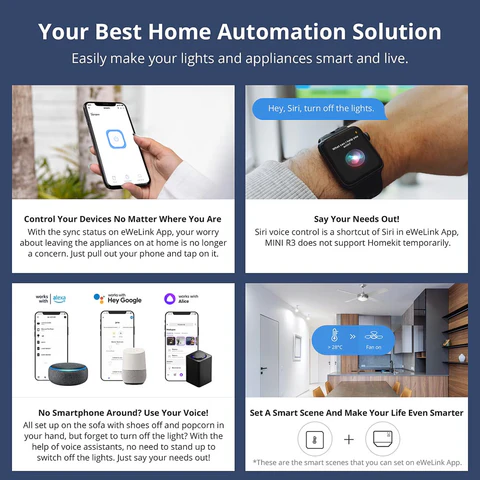 With a maximum load of 16A (up to 3500W), the MINIR3 is suitable for controlling lights, fans, and various household appliances. It also supports voice control with Amazon Alexa and Google Assistant, scheduling, and smart scenes for automated home control.